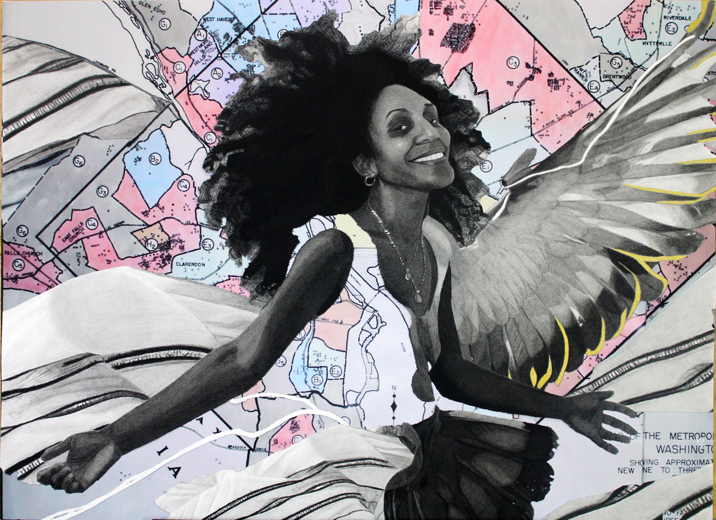 Falling Up (Charcoal, graphite, and acrylic drawing on DC Federal Housing (redlining map) Authority map, 39 11/16" x 29")